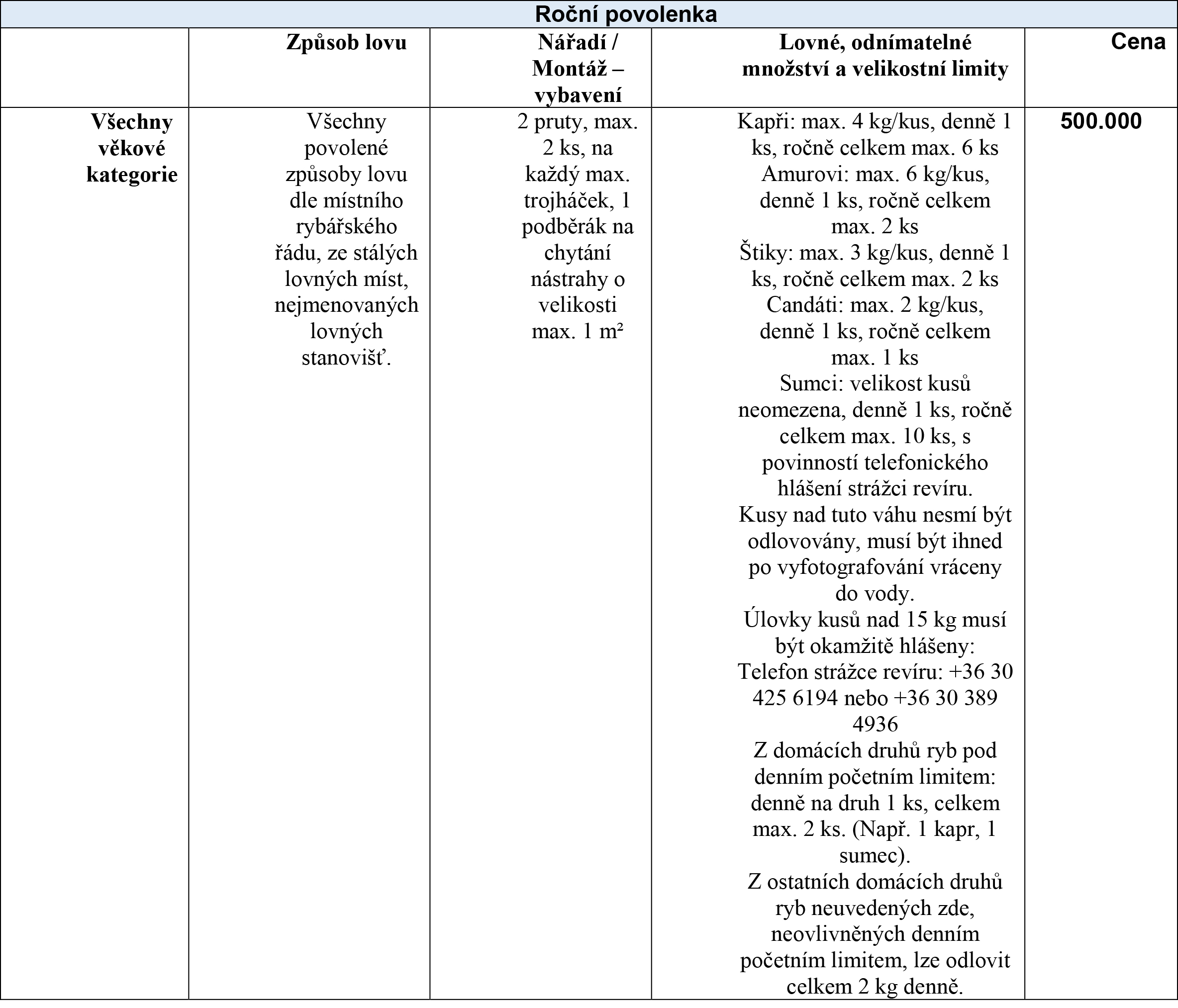 55. Lovné rozměry jednotlivých druhů ryb, celkové roční množství ryb určených k odnosu a denní početní limity jsou podrobně uvedeny v tabulce Ticket Matrix tohoto Místního rybářského řádu. Úlovky nad 15 kg musí být okamžitě hlášeny strážní službě. Konkrétní doby hájení jednotlivých druhů ryb odpovídají přílohám 8–9 vyhlášky č. 133/2013 (XII.29.) VM. Jednotlivci nad 25 kg smějí být vytaženi z vody pouze za přítomnosti strážce k vážení a fotografování, poté musí být co nejdříve vráceni zpět do vody. Nenahlášení úlovků nad +15 kg povede při zásahu strážce k odnětí povolenky na plochu. Lov a odnos sumců bez ročního velikostního omezení je povolen do maximálně 10 kusů na rybáře a rok, s podmínkou, že fakt ulovení a odnosu musí být také telefonicky nahlášen strážci a samozřejmě zapsán do deníku úlovků. Telefon: +36 30 389 4936 nebo +36 30 425 6194