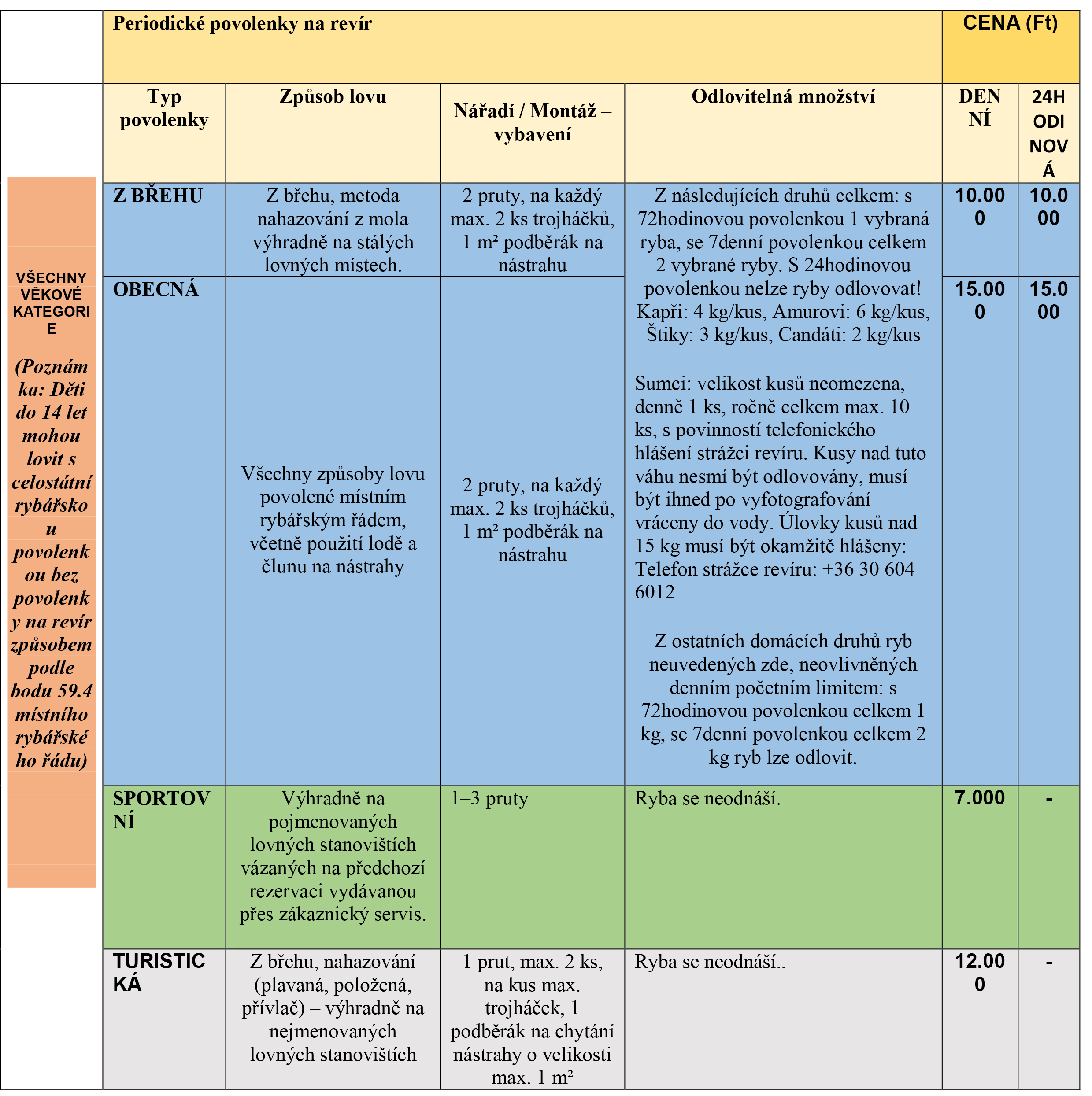 3. ROČNÍ OBECNÁ POVOLENKA NA PLOCHU: povolenka na 2 pruty opravňující k rybolovu jakoukoli povolenou metodou, včetně použití člunu nebo zavážecí lodičky.