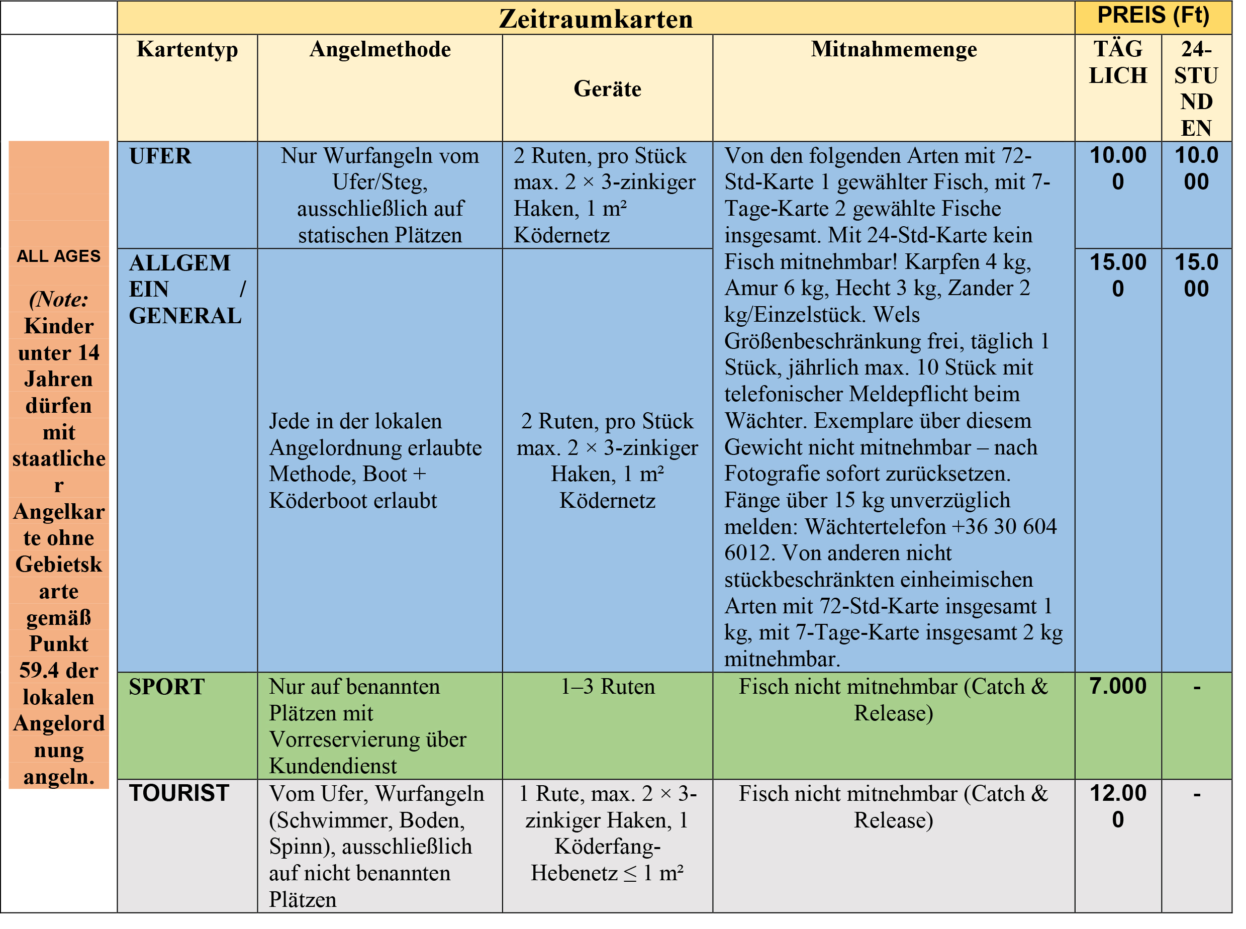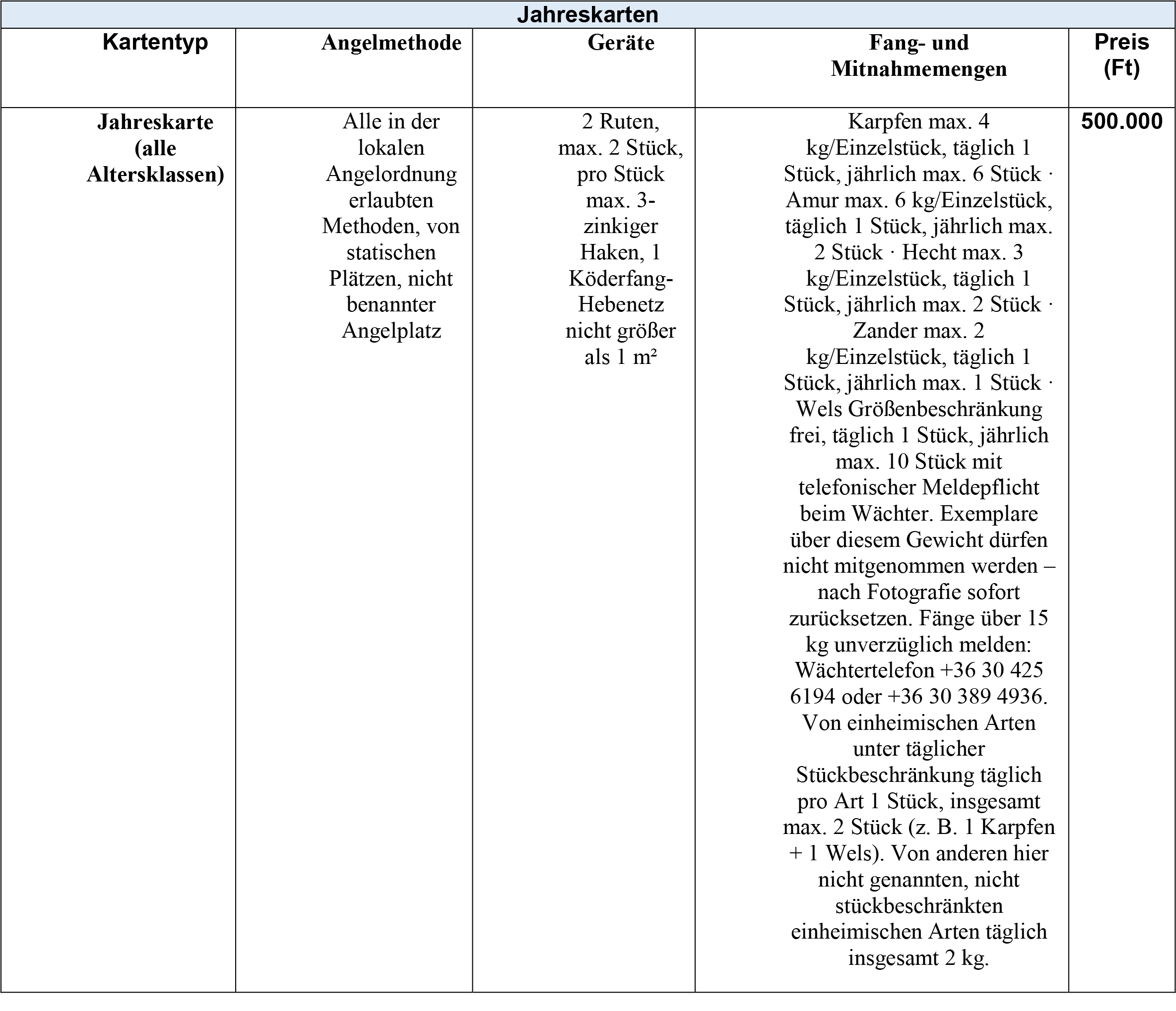 | ANGELSTELLENNUMMER / PEG | ANZAHL DER ANGLER | MAXIMALE RUTENZAHL (3 RUTEN PRO PERSON) | GEBIETSGEBÜHR / TAG / PERSON (HUF) |