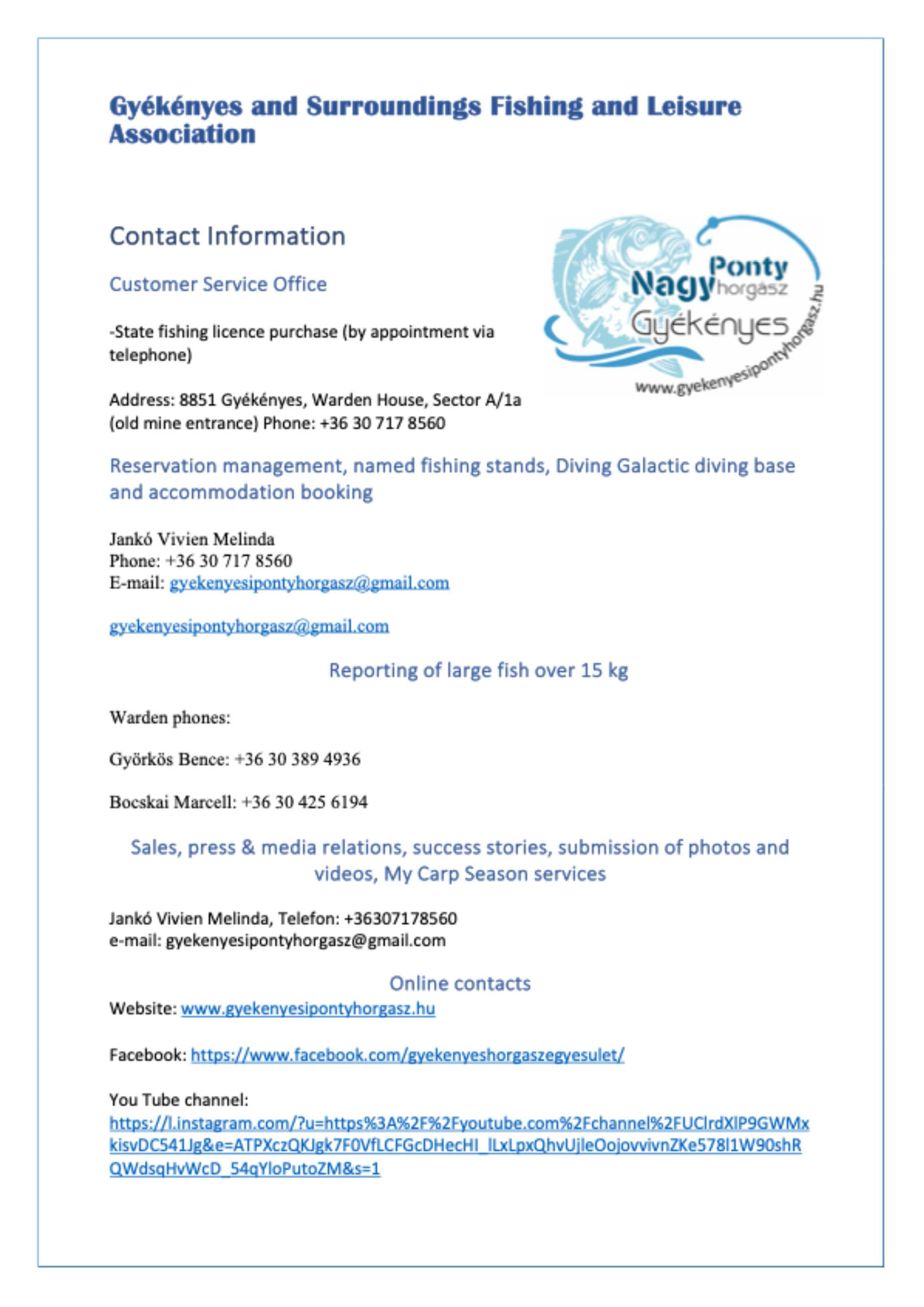 9. Before starting fishing, the angler is entitled and obliged to become familiar with the current fishing information for the water body indicated on the area ticket. The information service may be provided in the manner determined and published by the fishing organisation or through ad hoc warden information. Current information is available on www.gyekenyesipontyhorgasz.hu and the Nagy Ponty Horgász Gyékényes Facebook page.