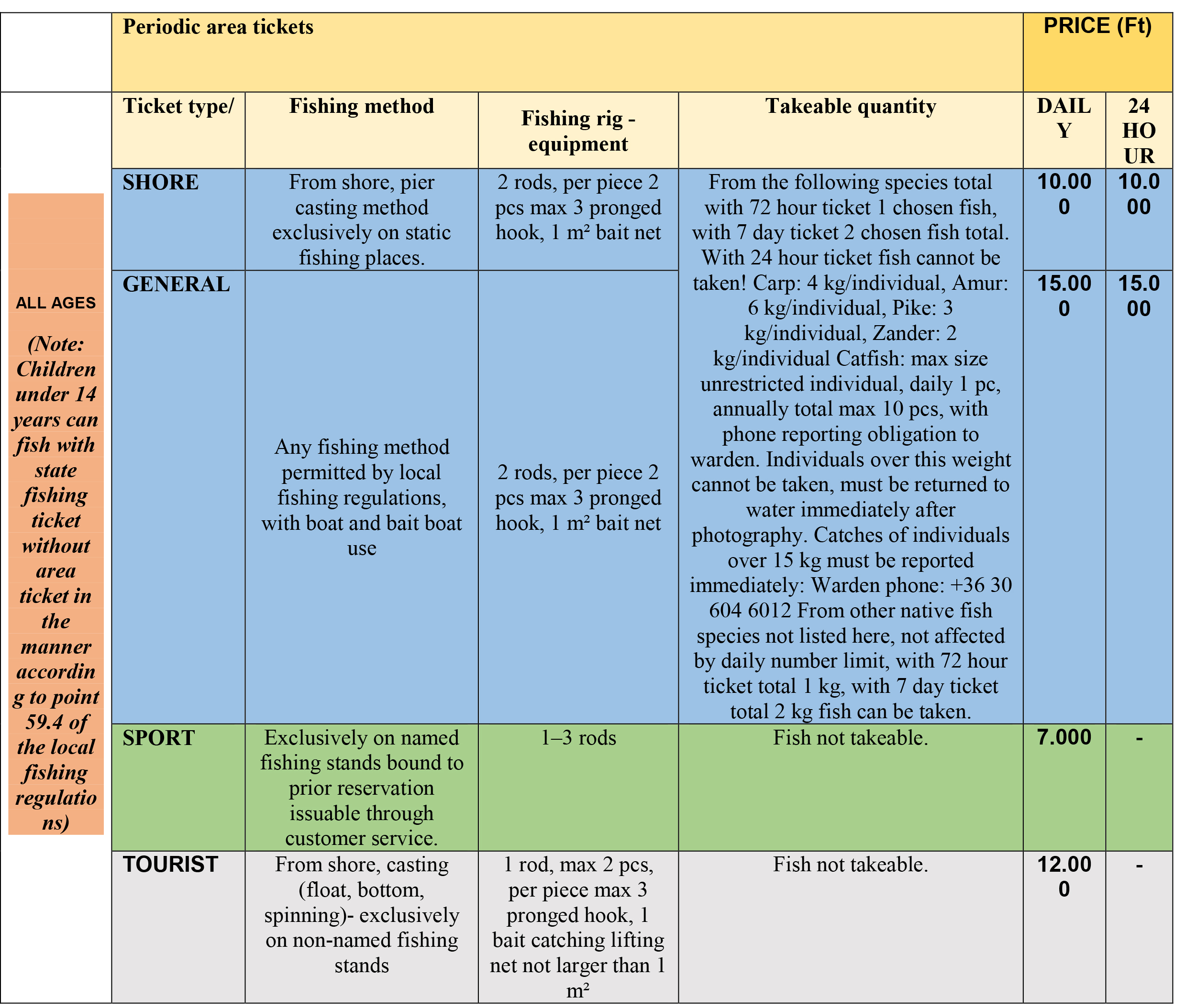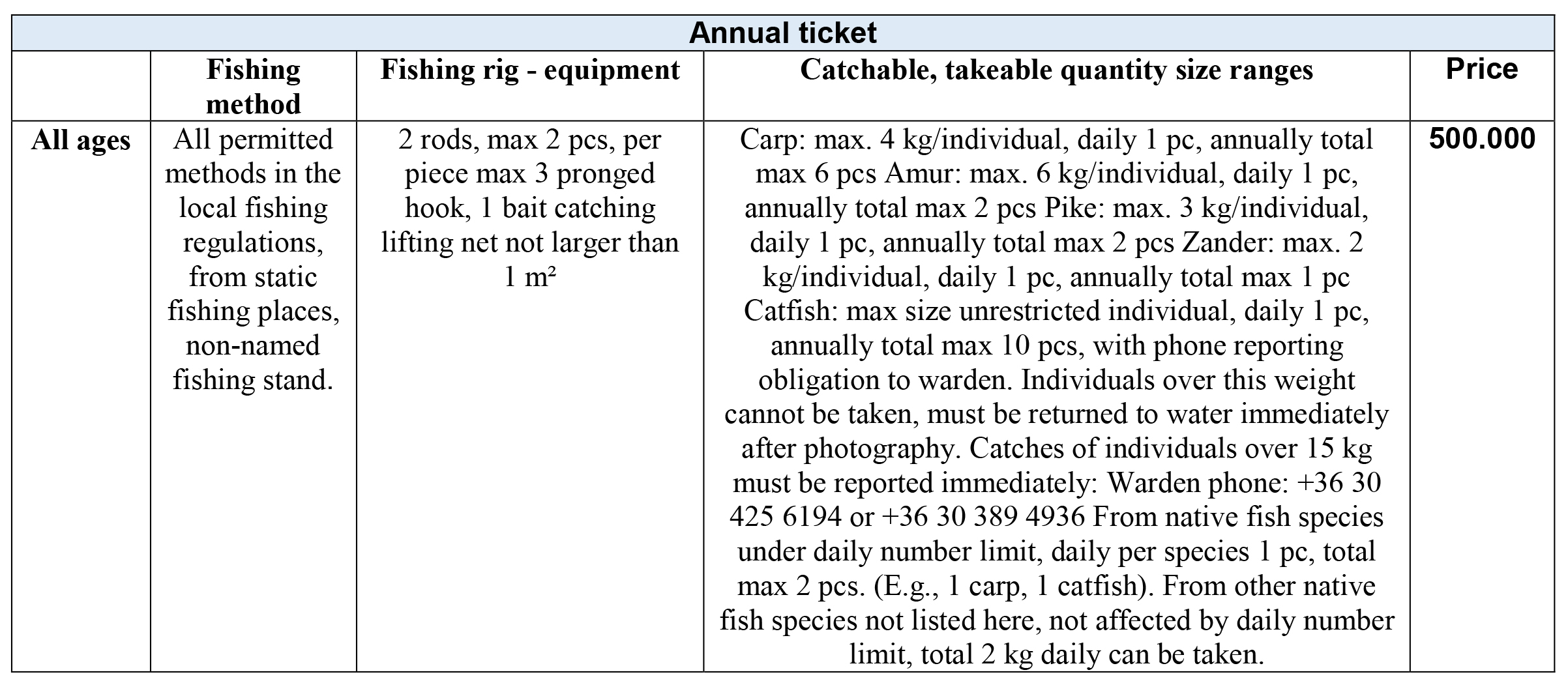55. The catchable size range of individual fish species, the annual total takeable fish quantity and daily number limit are detailed in the Ticket Matrix table of these Local Fishing Regulations. Catches over 15 kg must be reported to the warden service. The specific closed season for individual fish species corresponds to Annexes 8–9 of Decree 133/2013 (XII.29.) VM. Individuals over 25 kg may only be lifted from the water in the presence of the warden for weighing and photography, then released back into the water as soon as possible. Failure to report catches over +15 kg will result in revocation of the area ticket during warden action. Catfish fishing and take without annual size restriction is permitted up to 10 pcs/angler/year, with the condition that the fact of catch and take must also be reported by phone to the warden, and naturally entered in the catch log. Phone: +36 30 389 4936 or +36 30 425 6194
